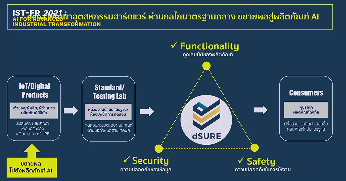 ดร.ศุภกร สิทธิไชย ได้ชี้แจงถึงวัตถุประสงค์ของ dSURE ว่าเป็นเครื่องมือสำหรับการเลือกสินค้าดิจิทัลของผู้บริโภค และสร้างกลไกการยกระดับคุณภาพผลิตภัณฑ์และบริการดิจิทัลของไทย โดยการหารือเป็นการซักซ้อมความเข้าใจในการทำงานร่วมกันในขั้นตอนการทดสอบกล้อง IP camera ที่มีการกำหนดมาตรฐานทั้งด้าน security, safety และ functionality ทั้งนี้ สินค้าที่ได้รับรอง dSURE จะช่วยสร้างความเชื่อมั่นแก่ผู้ใช้งานทางด้านการคุ้มครองข้อมูลส่วนบุคคล ตลอดจนนำมาใช้เป็นเกณฑ์เพื่อกำหนดรายการสินค้าดิจิทัลที่จะได้รับการส่งเสริมภายใต้มาตรการต่าง ๆ ของ depa ซึ่งเป็นการส่งเสริม และสนับสนุนผลิตภัณฑ์ดิจิทัลของผู้ประกอบการด้านดิจิทัลไทยให้ได้คุณภาพตามมาตรฐานสากลต่อไป